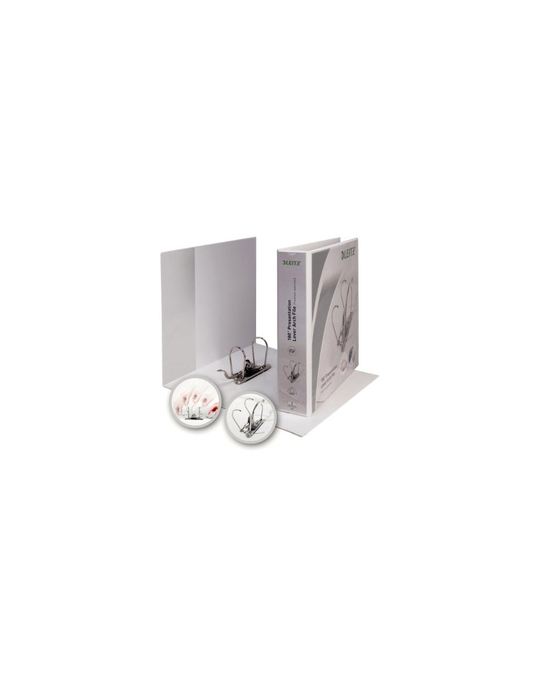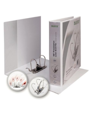 Fabricado en cartón forrado de polipropileno encolado y soldado en los extremos. Con bolsa en portada y lomo para personalización. Incluye bolsillo interior. Innovador mecanismo de Leitz que gira 180º, con 5 años de garantía. Tamaño A4 maxi. Color blanco.