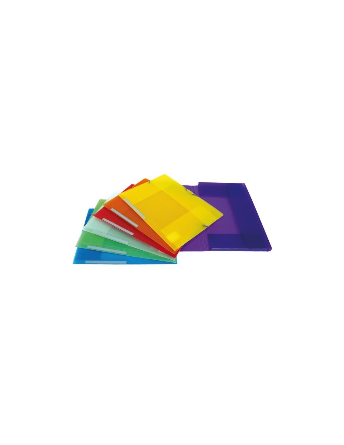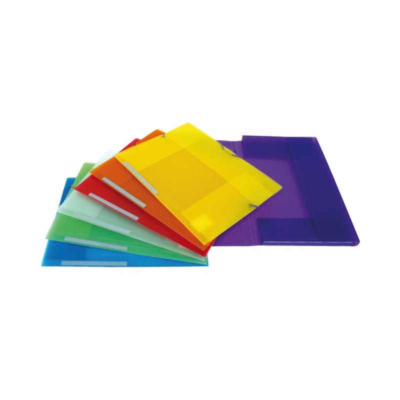 Carpetas tres solapas en polipropileno translúcido semirrígido de 500 micras con cierre de gomas en colores. Lomo recto rotulable.