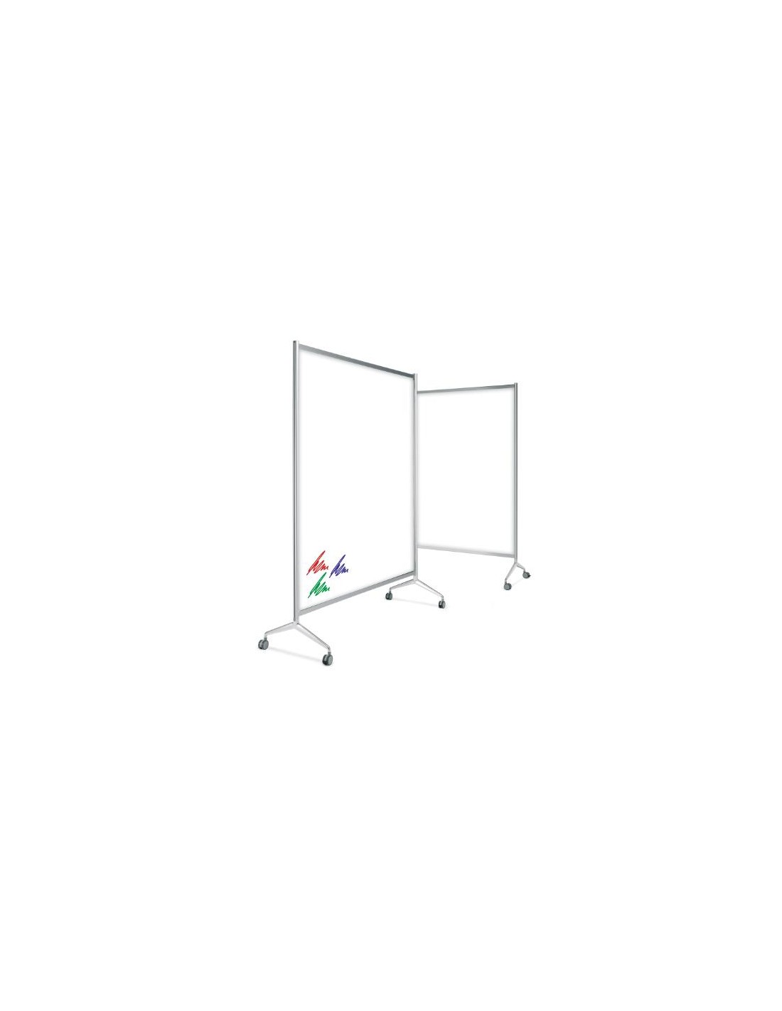 Sistema de mampara modular fabricada con perfil de aluminio color plata y estructura provista de pies de fundición con ruedas y freno. Disponible en pizarra lacada blanca rotulable, policarbonato acanalado y panel acústico disponible en 7 colores.