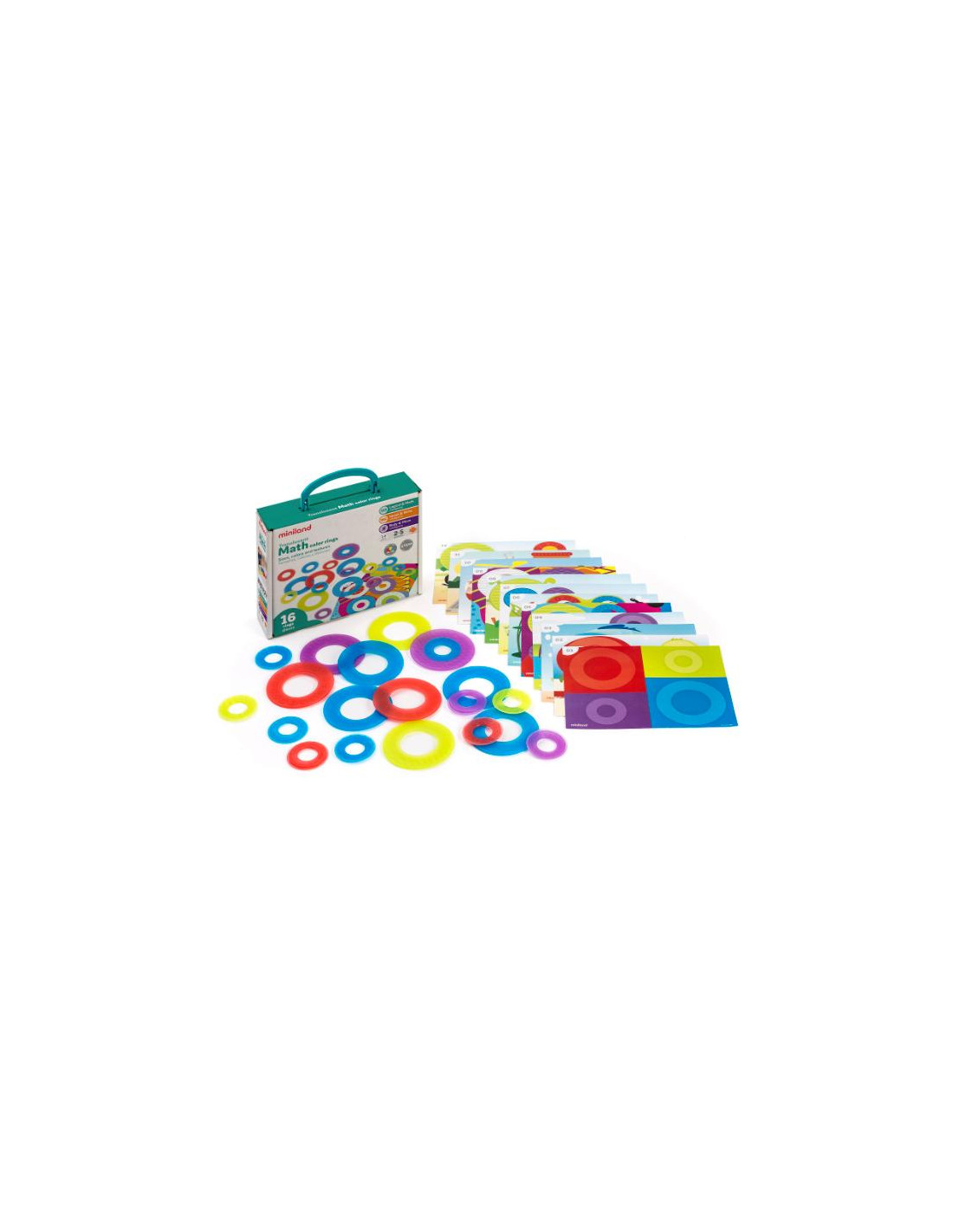 Set de 16 aros translúcidos y 12 tarjetas de actividades de diferentes temáticas y grados de dificultad, con el que trabaja la diferencia de tamaños, colores y texturas. Apto para el juego sobre mesa de luz.