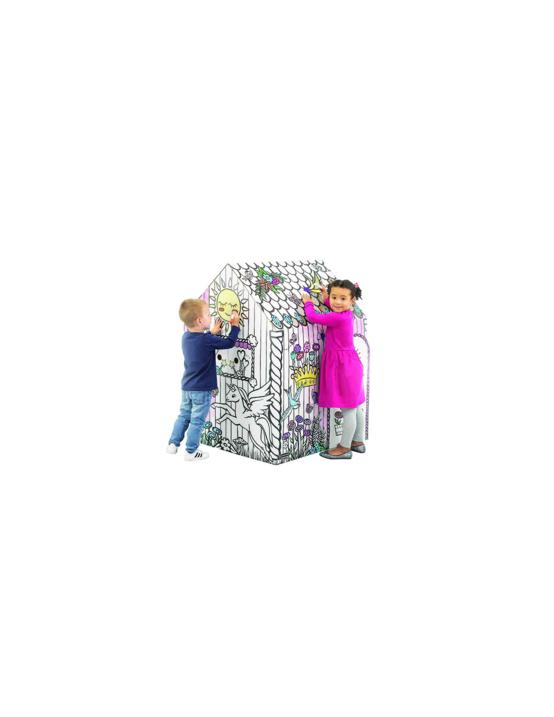 La Casa de Juego Unicorn de Bankers Box es una estructura de cartón resistente, diseñada para proporcionar a los niños un espacio de juego creativo y seguro. Decorada con un encantador tema de unicornios, esta casa permite a los pequeños disfrutar de un ambiente mágico y personalizado donde pueden explorar su imaginación. Fácil de montar y desmontar, es perfecta para espacios interiores, y su material ecológico y reciclable la convierte en una opción sostenible.