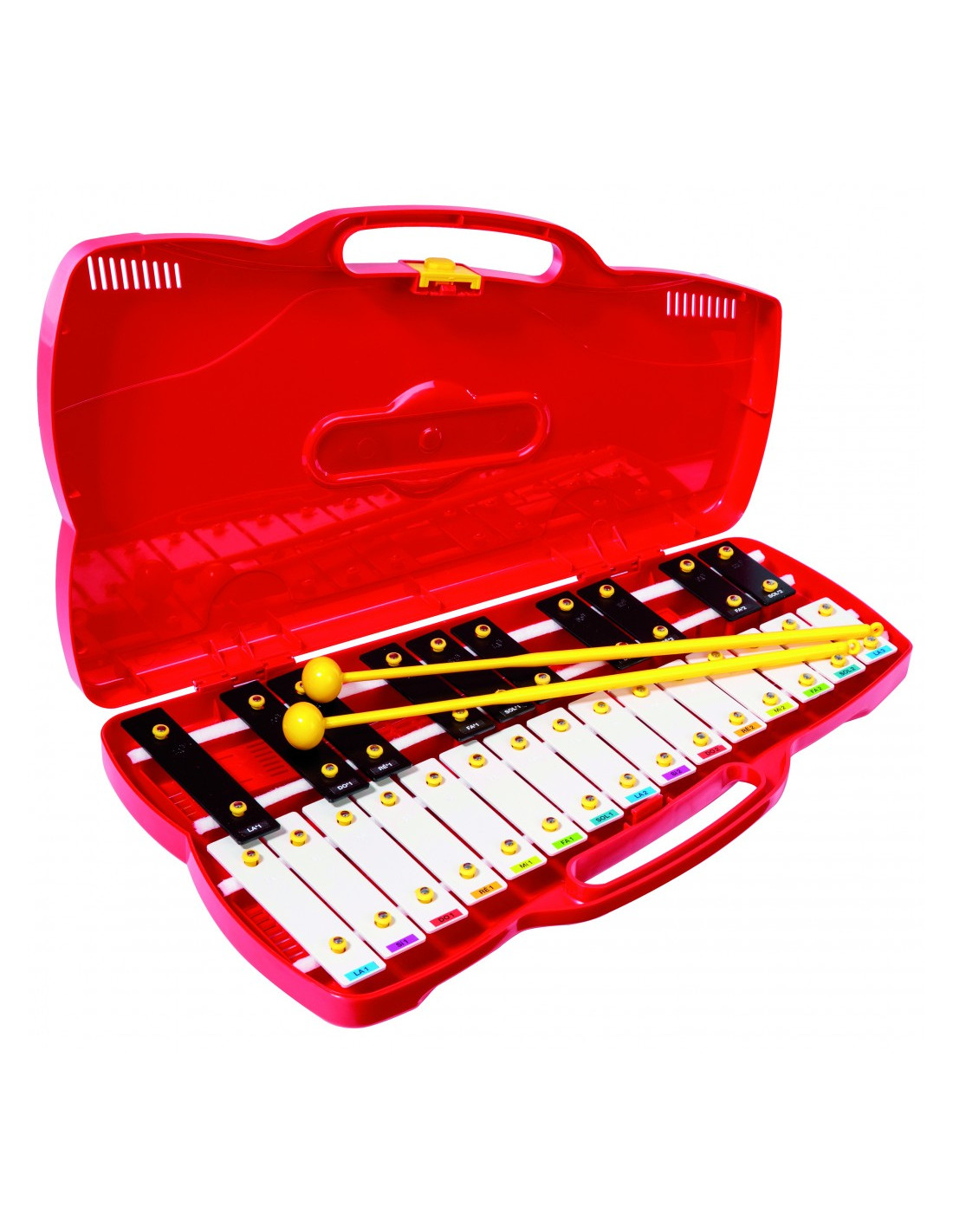 A partir de 4 años. Un instrumento utilizado por miles de profesores de música para un primer acercamiento a la práctica musical. El Pianot está compuesto por : 2 octavas cromáticas de La4 a La6 y 25 láminas con los colores del teclado del piano