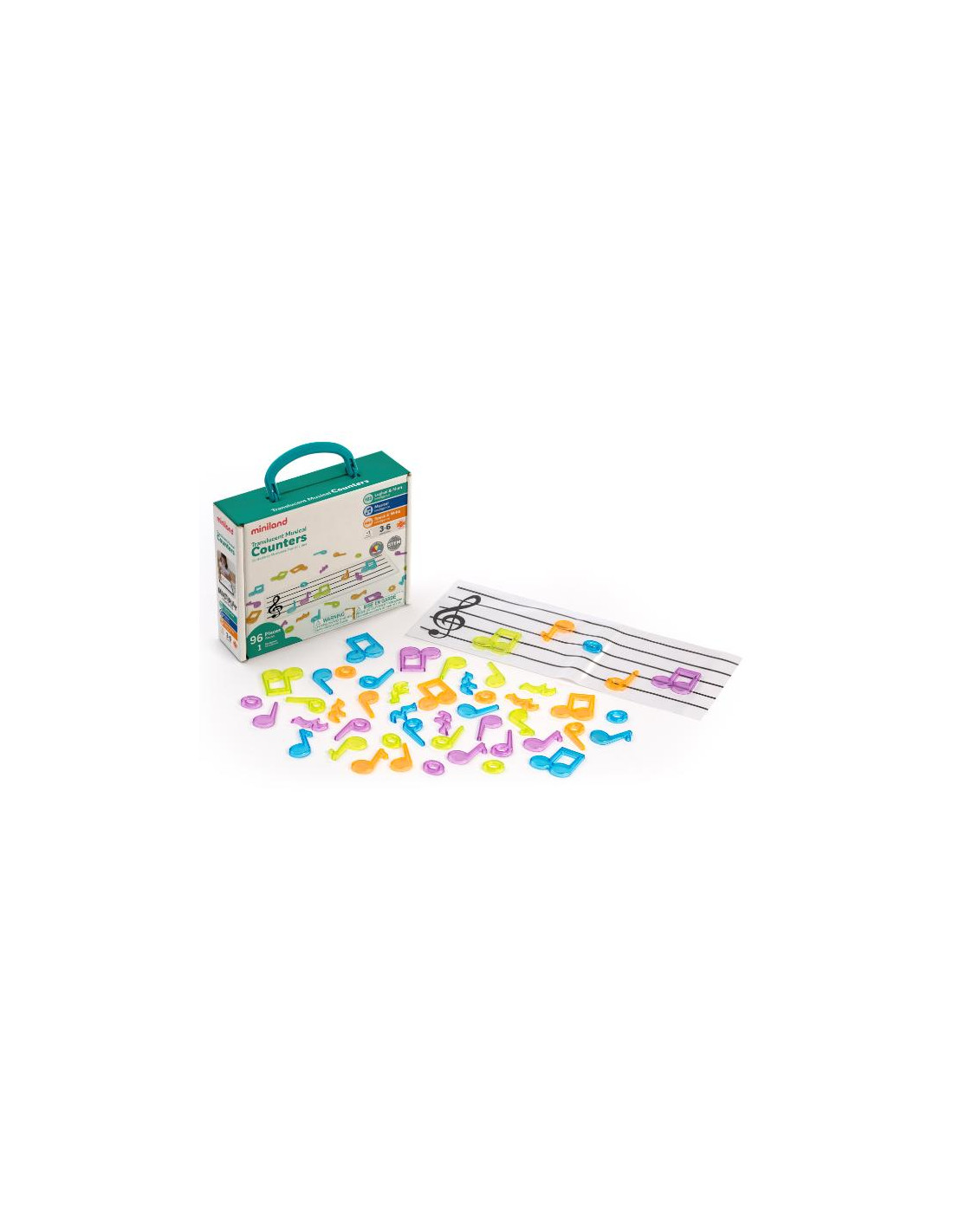Set de contadores translúcidos en varios colores y en forma de notas musicales. Con este juego los niños aprenderán de forma divertida a conocer, diferenciar y clasificar las principales notas musicales. Incluye pentagrama transparente, muy útil para la in