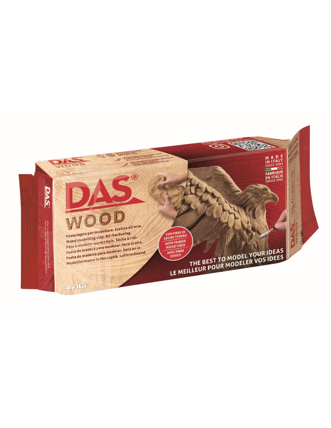 DAS Wood es la nueva pasta para modelar de madera y base agua ideal para modelismo, con fibras de madera blanda. Versátil e innovadora, es una pasta para modelar profesional para artistas, diseñadores, artesanos, aficionados, y también es adecuada para usuarios ocasionales y escuelas porque es fácil de usar y muy gratificante. Endurece al aire, se seca lentamente y permite crear esculturas de madera resistentes y duraderas, que pueden ser esculpidas durante la fase de secado con gubias, espátulas y cinceles y decoradas una vez secas con pinturas y barnices. Se puede modelar en bajorrelieve y en redondo, con chapa y cuerda, solo o con otros materiales, como madera, cristal, cartón... También es ideal para trabajos de up-cycling y restauración.
