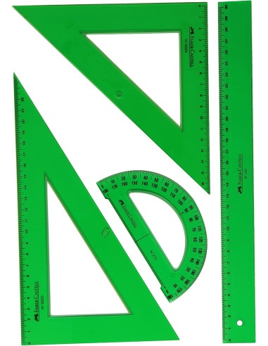 Uso escolar y profesional. Fabricada en plástico de metacrilato verde transparente. Reglas graduadas a prueba de emborronamiento; Escuadra y cartabon distintos tamaños