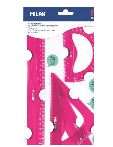 Kit de trazado: regla 30 cm, escuadra 90º/45º/45º, cartabón90º/60º/30º y transportador 180º 10 cm. Colores translúcidos. Material flexible y resistente.