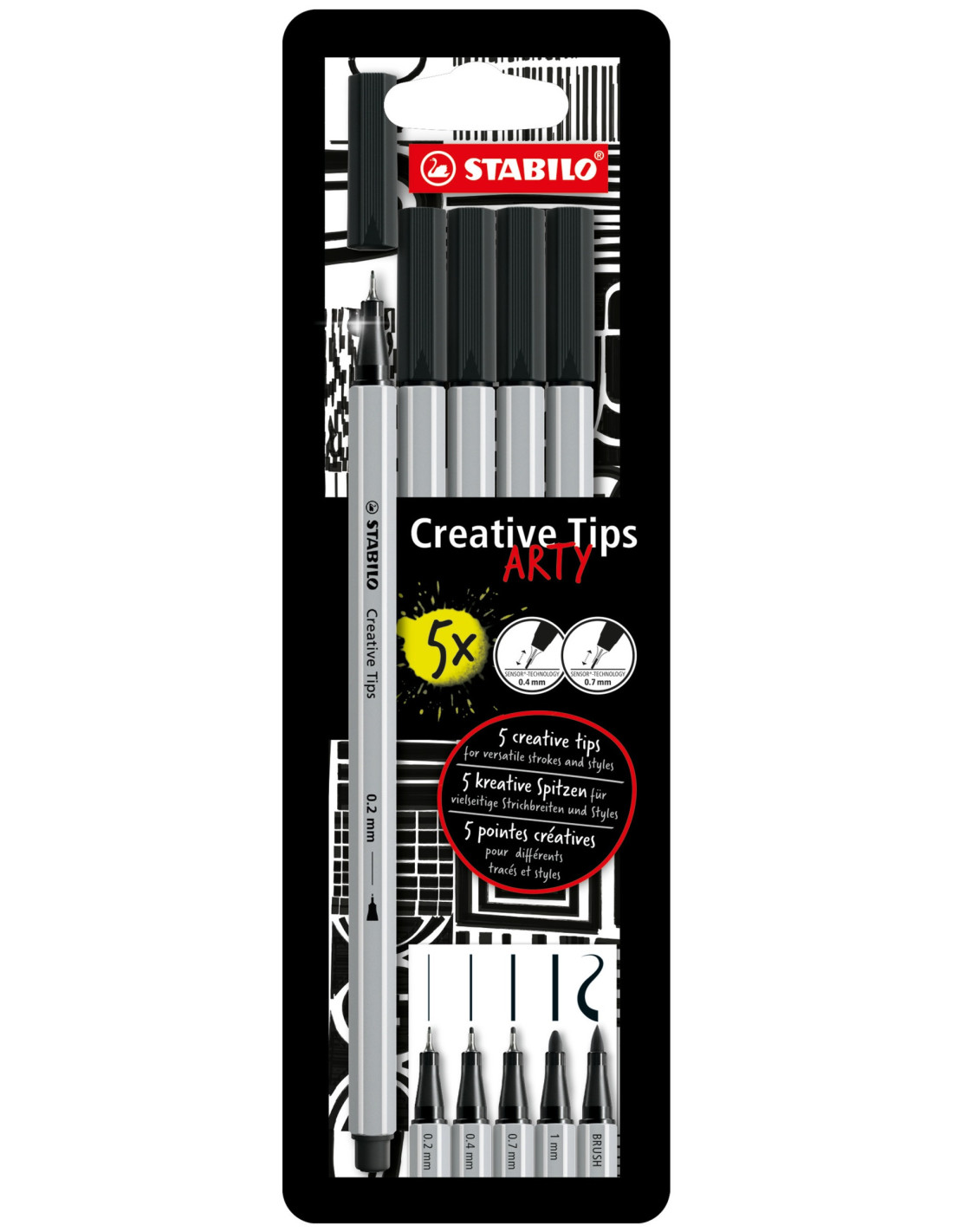 STABILO Creative Tips es una colección de rotuladores cuidadosamente seleccionada que ofrece una experiencia única mix and match para diferentes anchos de trazo y estilos. La tinta con base de agua y la elección de cinco puntas diferentes hacen que sea fácil generar numerosos efectos impresionantes. Entre ellos se incluye un rotulador de punta de fibra con un ancho de trazo de 1 mm, un rotulador pincel multiusos con un ancho de trazo que se puede ajustar con la presión, y tres rotuladores finos diferentes con puntas de metal con anchos de trazo de 0,2 mm, 0,4 mm y 0,7 mm para trazos precisos de extrafinos a medios. Los rotuladores finos con puntas de 0,4 mm y 0,7 mm incorporan además la tecnología Sensor, que hace que la punta se cargue por resorte para compensar una presión excesivamente firme.