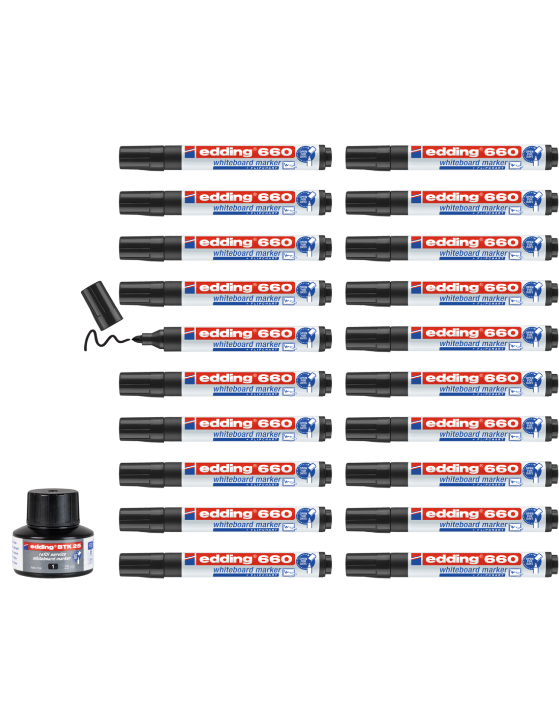 El Edding 660 es un rotulador diseñado para pizarras blancas, ideal para presentaciones, clases y reuniones. Este modelo cuenta con una punta cónica que permite un trazo variable de 1,5 a 3 mm, adaptándose a diferentes necesidades de escritura. Su tinta de secado rápido es resistente a la luz y se borra fácilmente de superficies no porosas como el esmalte y la melamina. Además, incorpora el sistema "cap-off", lo que significa que puede permanecer destapado durante varios días sin secarse.